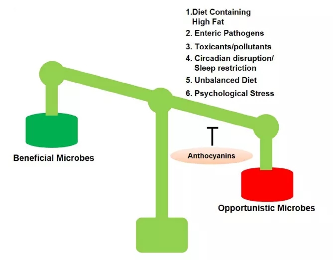 接著,作者論述了腸道菌群失調(diào)及其發(fā)病因素,包括很多影響因素,并詳細(xì)闡述了各影響因素與腸道微生態(tài)的關(guān)系,且花青素可參與調(diào)節(jié)糾正這一失衡(圖1)。