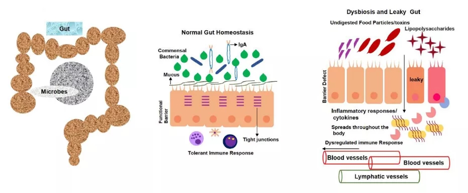 已有研究證明,有害細(xì)菌會產(chǎn)生各種毒素和多糖,而這些毒素和多糖又會導(dǎo)致腸壁發(fā)炎,引起腸道泄露。上皮細(xì)胞炎癥還導(dǎo)致緊密連接蛋白的丟失,為未消化的食物顆粒、毒素和炎癥細(xì)胞因子進(jìn)入血液循環(huán)提供了機(jī)會。