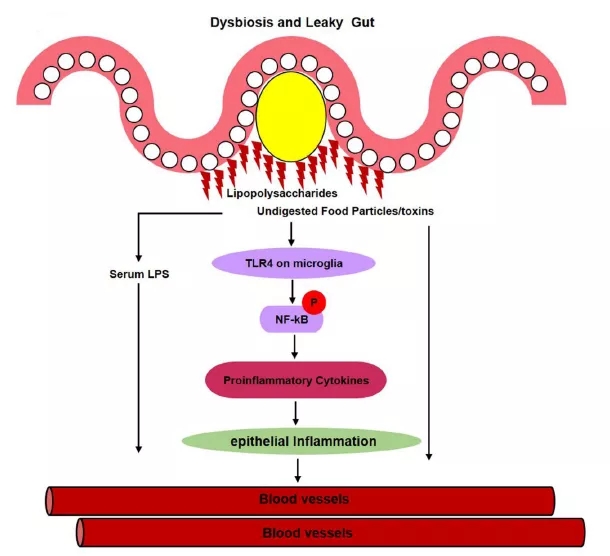 腸道泄露會增加循環(huán)炎性因子(LPS)和促炎細(xì)胞因子釋放(圖3)。含有毒素和脂多糖(LPS)的血液隨后通過受損的血腦屏障進(jìn)入大腦。
