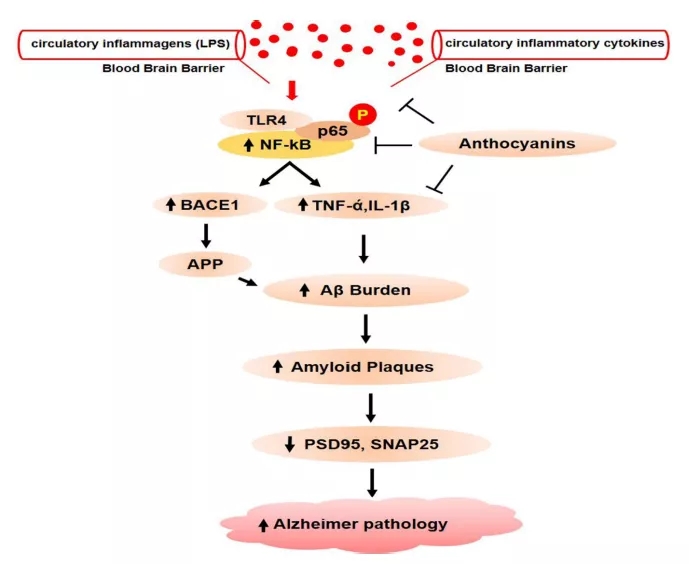 另外,Ali T和Khan, M.S等最近報道,花青素可以顯著改善促炎細(xì)胞因子和ROS/JNK的表達(dá),抑制神經(jīng)炎癥和阿爾茨海默病的病理進(jìn)程。