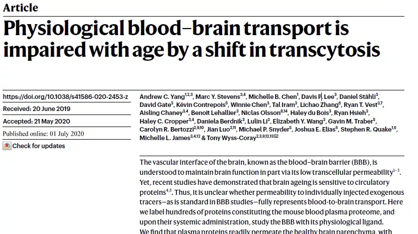 最近,發(fā)表在頂尖學(xué)術(shù)期刊《Nature》上的一篇有關(guān)“血腦屏障”(blood brain barrier,BBB)的研究論文,引起了巨大的反響。作者是來(lái)自斯坦福大學(xué)醫(yī)學(xué)院的科學(xué)家們,他們?cè)诒容^了年輕小鼠和老年小鼠的大腦后,發(fā)現(xiàn)了一個(gè)令人意外的現(xiàn)象。