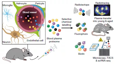 后續(xù)的研究顯示,除了染料,血流內(nèi)的很多物質(zhì),比如致炎因子、大分子藥物等,都會(huì)被這層“血腦屏障”所阻擋,無(wú)法輕易滲透進(jìn)腦組織。 隨著年齡增長(zhǎng),血腦屏障也可能出現(xiàn)“滲漏”問(wèn)題,就像年久失修的水管一樣。近年來(lái)的一些研究發(fā)現(xiàn),血腦屏障的通透性變大與認(rèn)知功能衰退有一定關(guān)系,例如在腦外傷、阿爾茨海默病患者當(dāng)中,一些有神經(jīng)毒性的蛋白質(zhì)分子就更容易從血管“漏”進(jìn)腦組織,而這可能是造成病變的重要因素。 血腦屏障就像是一道“圍墻”,它保護(hù)了大腦免受傷害,但也為藥物的輸送制造了困難,重要性不言而喻。 在這項(xiàng)新的研究中,科學(xué)家們采用了新的示蹤方法,結(jié)果卻發(fā)現(xiàn),大腦在年輕健康時(shí),血腦屏障的滲透性其實(shí)并不差!血液中的大量蛋白質(zhì)能順利進(jìn)入大腦,速率會(huì)比進(jìn)入老年大腦更快,數(shù)量也更多。 Tony Wyss-Coray教授領(lǐng)銜的研究小組并沒(méi)有采用注射外源示蹤劑的方法,而是采用了新的方法。他們給數(shù)百種構(gòu)成血漿的內(nèi)源蛋白質(zhì)打上了化學(xué)小標(biāo)簽,然后追蹤這些蛋白質(zhì)在小鼠全身的活動(dòng)軌跡,尤其是與血腦屏障的相互作用。 他們由此發(fā)現(xiàn),在年輕健康小鼠中,進(jìn)入大腦的血漿蛋白數(shù)量要比以前認(rèn)為的多得多。而在年老的小鼠中,滲透到腦中的血漿蛋白含量卻比較低。 這個(gè)結(jié)果令人驚訝,因?yàn)槭褂猛庠葱允聚檮┑亩囗?xiàng)研究表明,血腦屏障通透性隨年齡增長(zhǎng)而增加,并強(qiáng)調(diào)這種增加是導(dǎo)致年齡相關(guān)認(rèn)知能力下降的一個(gè)因素。 這一看似矛盾的結(jié)果,經(jīng)過(guò)研究人員對(duì)蛋白運(yùn)輸機(jī)制的進(jìn)一步研究得到了解釋。原來(lái),構(gòu)成血腦屏障的主要成分——血管內(nèi)皮細(xì)胞,能夠限制蛋白質(zhì)進(jìn)出,因?yàn)檫@些細(xì)胞上分布著很多受體。